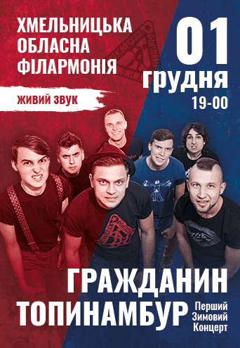 Гражданин Топинамбур. Перший Зимовий Концерт. состоится 1 декабря 2017, 19:00, пятница в Хмельницкая областная филармония. С помощью сервиса internet-bilet.ua, Вы сможете с легкостью забронировать, заказать и купить билеты на интересующий Вас концерт, спектакль, оперу, балет, мастер-классы, спортивные и детские мероприятия, оплатив их самым удобным для Вас способом: через интернет банковской картой VISA/MasterCard, наличными или курьером, если сделаете заказ билета c доставкой.