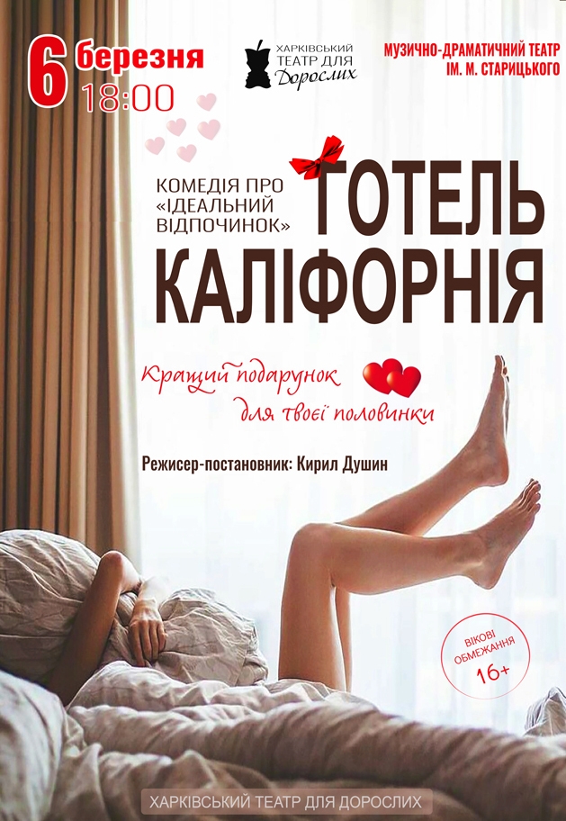 Театр Для Взрослых. Спектакль "Отель Калифорния" состоится 6 марта 2026, 18:00, пятница в Хмельницкий академический театр им. Старицкого. С помощью сервиса internet-bilet.ua, Вы сможете с легкостью забронировать, заказать и купить билеты на интересующий Вас концерт, спектакль, оперу, балет, мастер-классы, спортивные и детские мероприятия, оплатив их самым удобным для Вас способом: через интернет банковской картой VISA/MasterCard, наличными или курьером, если сделаете заказ билета c доставкой.