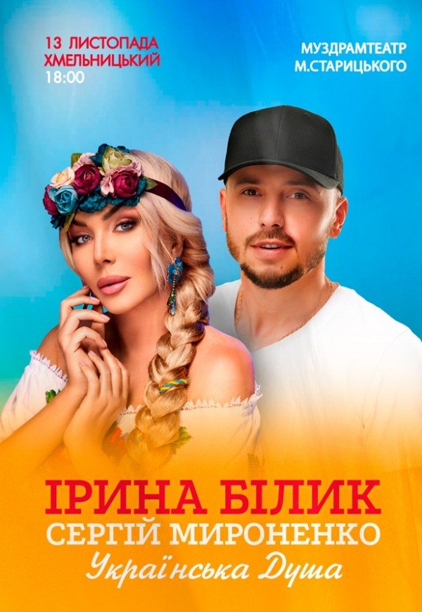 Купить билет на Ірина Білик та Сергій Мироненко. Тур «Українська душа» можно не отходя от компьютера!