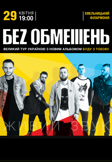 БЕZ ОБМЕЖЕНЬ состоится 29 апреля 2018, 19:00, воскресенье в Хмельницкая областная филармония. С помощью сервиса internet-bilet.ua, Вы сможете с легкостью забронировать, заказать и купить билеты на интересующий Вас концерт, спектакль, оперу, балет, мастер-классы, спортивные и детские мероприятия, оплатив их самым удобным для Вас способом: через интернет банковской картой VISA/MasterCard, наличными или курьером, если сделаете заказ билета c доставкой.