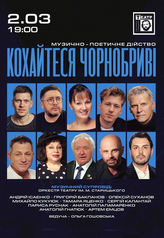 Це проєкт, у якому поезія знову стає подією — не сторінкою з підручника, а живим, сучасним і надзвичайно сильним переживанням. В основі програми — твори Тараса Шевченка, Лесі Українки, Василя Симоненка, Василя Стуса та інших визначних українських поетів, чия лірика торкається найглибших почуттів: любові, пристрасті, ніжності, внутрішньої сили та людської гідності. Їхні вірші звучать у виконанні відомих українських акторів театру і кіно у супроводі оркестру Театру ім. М. Старицького, створюючи єдине цілісне сценічне дійство, де слово, музика і світло працюють разом. “Кохайтеся, чорнобриві” — це: